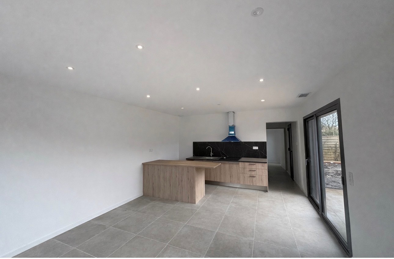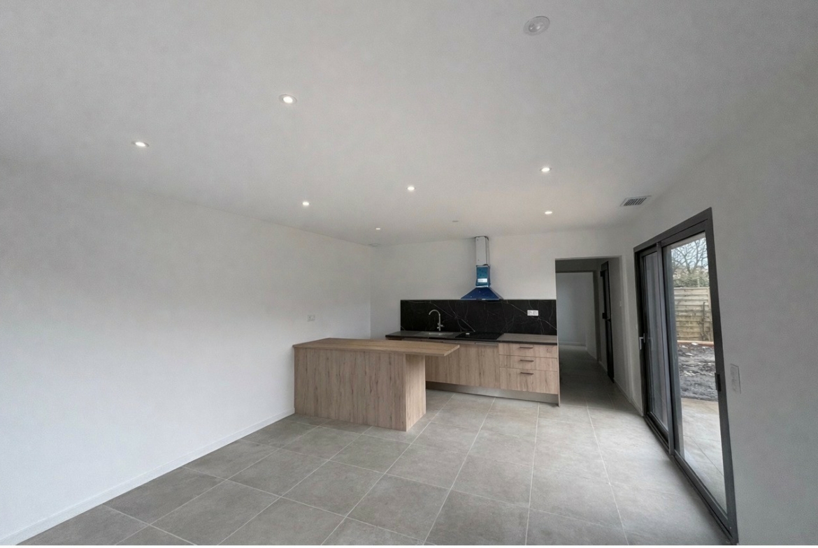 Toctoucau – Maison neuve comprenant une entrée avec placard, un séjour avec cuisine ouverte meublée et équipée, donnant sur terrasse et jardin. Une chambre avec placard, une salle de douche et WC.