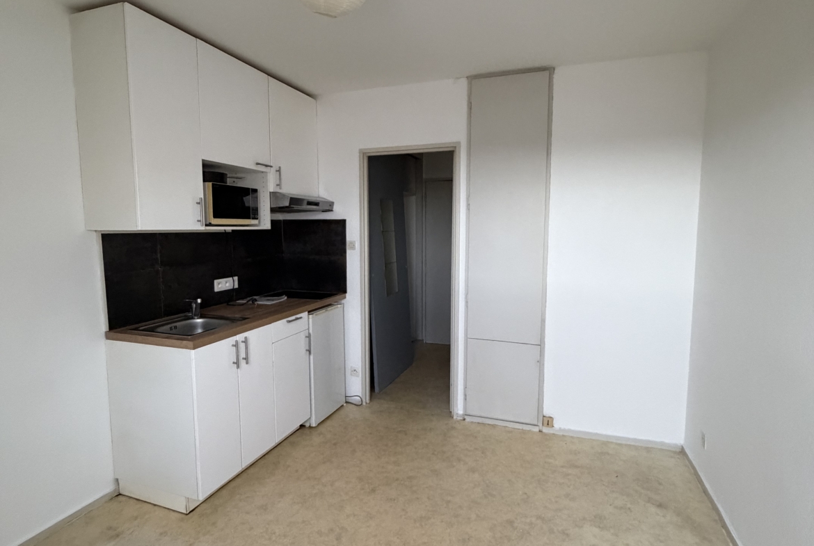 Appartement de type studio comprenant une pièce de vie avec coin kitchenette meublée et équipée, une salle de douche avec WC. Grand placard intégré à l’entrée.