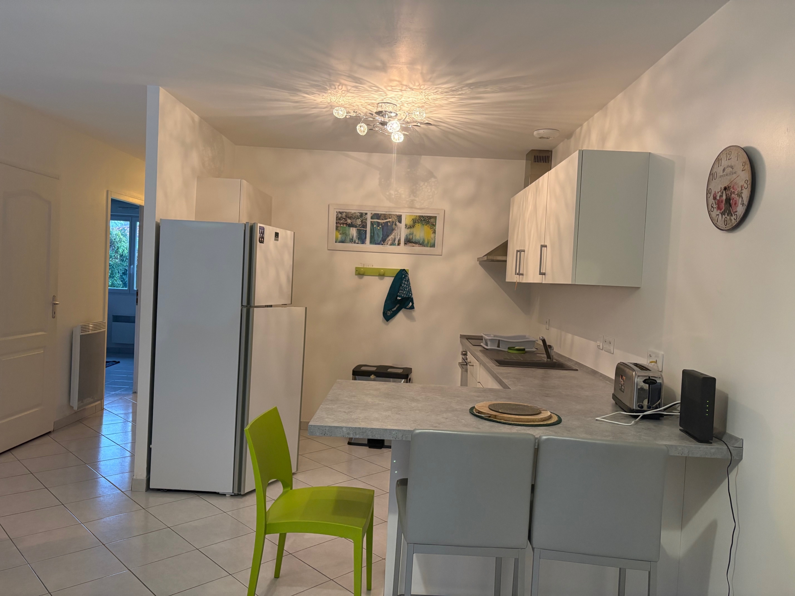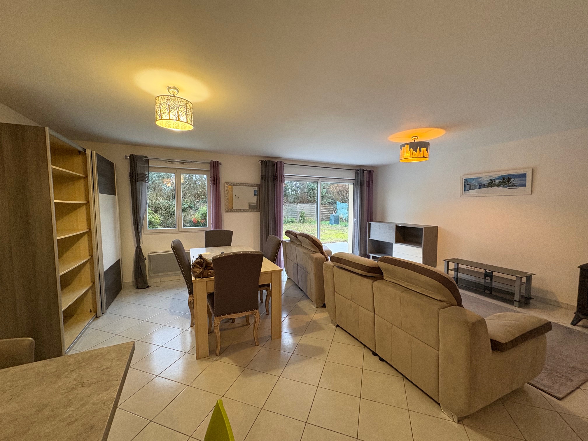 Une maison meublée de type T4 se composant d’un séjour lumineux avec une cuisine meublée et équipée avec un bar.